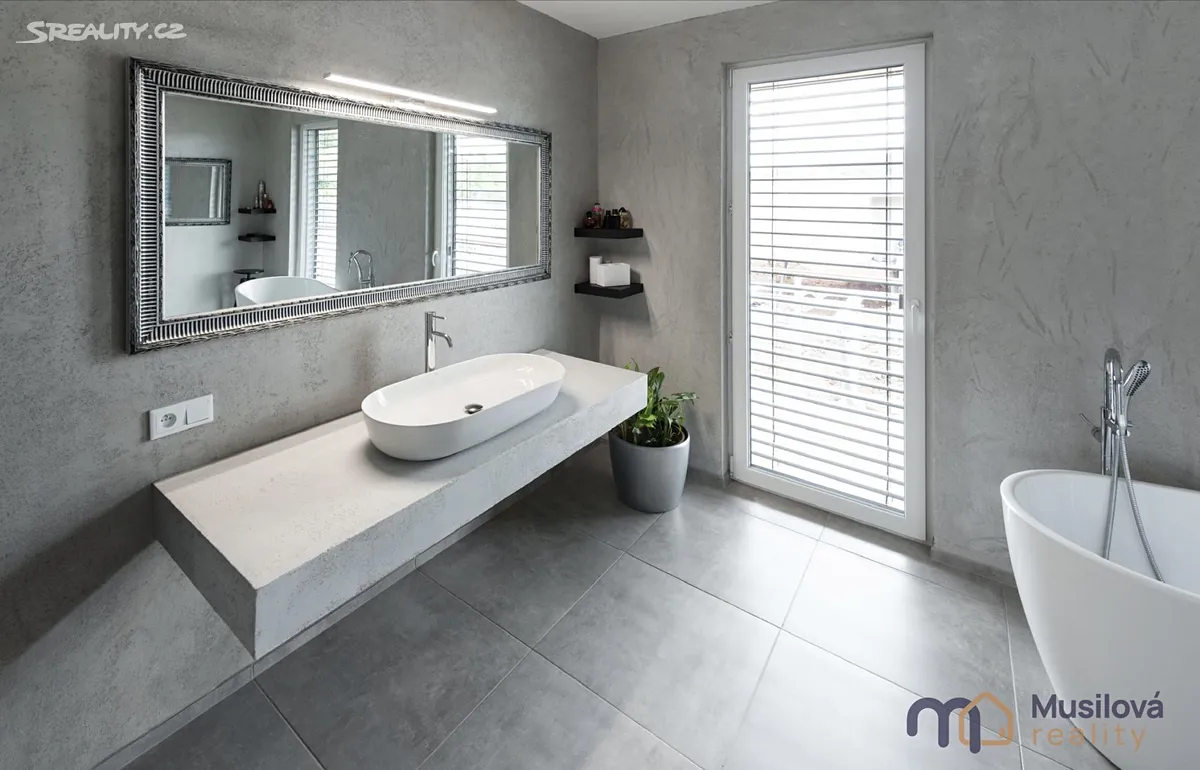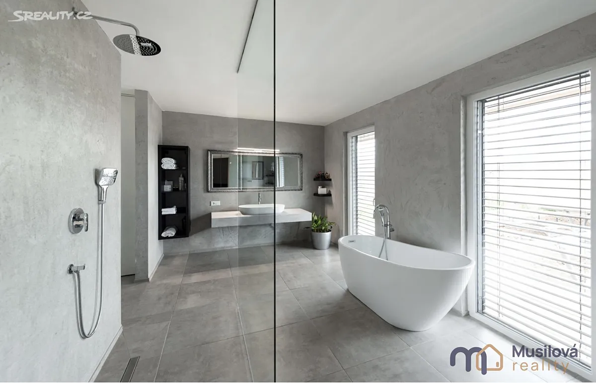 Každý detail interiéru byl navržen s důrazem na kvalitu a estetiku. Velkoformátová eurookna propouštějí maximum přirozeného světla a zároveň nabízejí krásné výhledy do okolí. Z každého pokoje je navíc přímý vstup na dřevěnou terasu, která plynule propojuje interiér s exteriérem a podtrhuje celkovou vzdušnost prostoru. Pro vyšší komfort a soukromí jsou všechna okna vybavena venkovními roletami. Elegantní kuchyňská linka je osazena špičkovými spotřebiči, koupelna je obložena moderními velkoformátovými dlaždicemi a celý dům je vytápěn podlahovým topením s uhlíkovými vlákny, které zajišťuje maximální energetickou efektivitu. Samozřejmostí je připojení na obecní vodovod i kanalizaci. Součástí domu je garáž pro dva vozy a také venkovní parkování na vlastním pozemku.